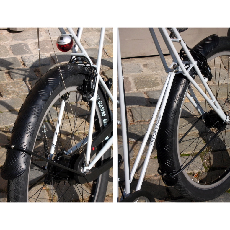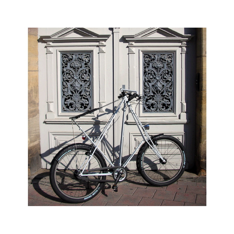 für 26" Zoll Laufräder bis 60mm Breite, Cantileversockel vorne und hinten, Gabel mit Ahead-Steuersatz 1 1/8 Zoll, Excenter-Tretlager (besonders geeignet für Nabenschaltungen z.B. Rohloff 14-Gang), spezielle Halterung für Sattelgurt, Trinkflaschenhalter, Lamperhalter in der Gabel, Anlötteil für Rücklicht, Pletscher-Anlötteil für Seitenständer, Schutzbleche Alu Riffelblech, Lenker handgearbeitet für 1 1/8 Ahead-Steuersatz