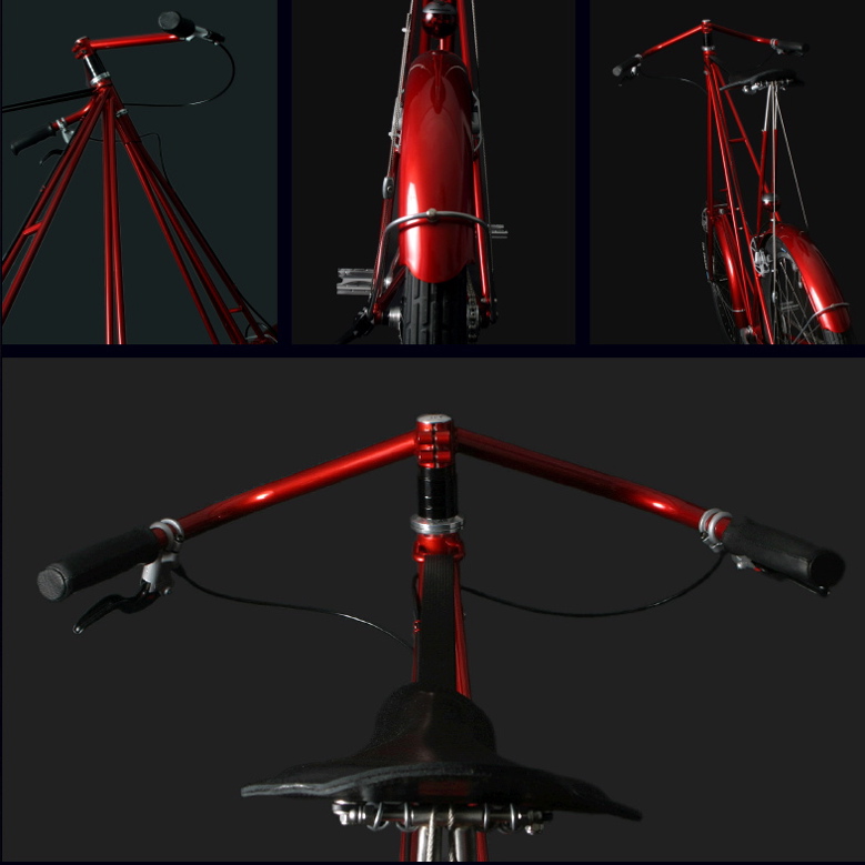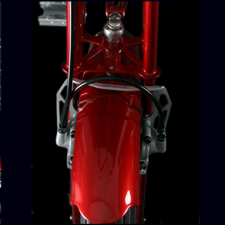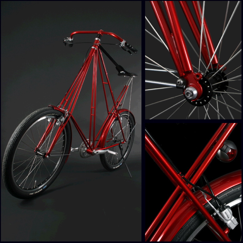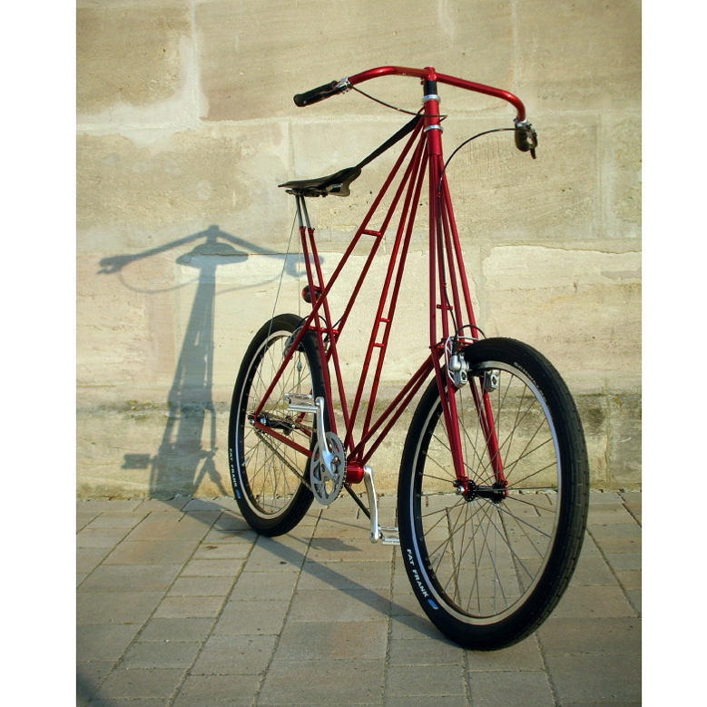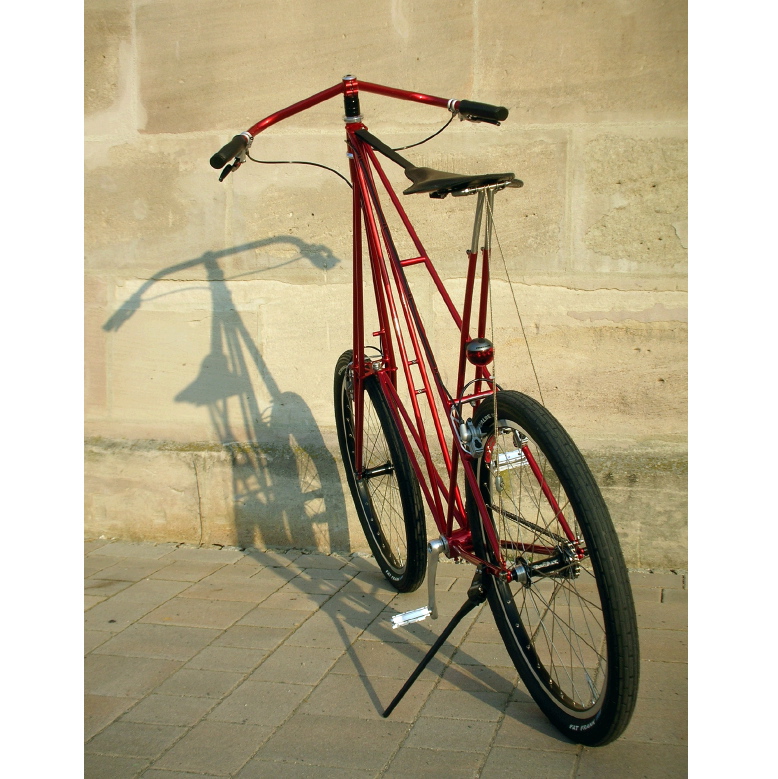 für 26" Zoll Laufräder bis 60mm Breite, Cantileversockel vorne und hinten, Gabel mit Ahead-Steuersatz 1 1/8 Zoll, Excenter-Tretlager (besonders geeignet für Nabenschaltungen z.B. Rohloff 14-Gang oder Singlespeed), spezielle Halterung für Sattelgurt, Trinkflaschenhalter, Lamperhalter in der Gabel, Anlötteil für Rücklicht, Pletscher-Anlötteil für Seitenständer, Schutzbleche Stahl, Lenker handgearbeitet für 1 1/8 Ahead-Steuersatz
